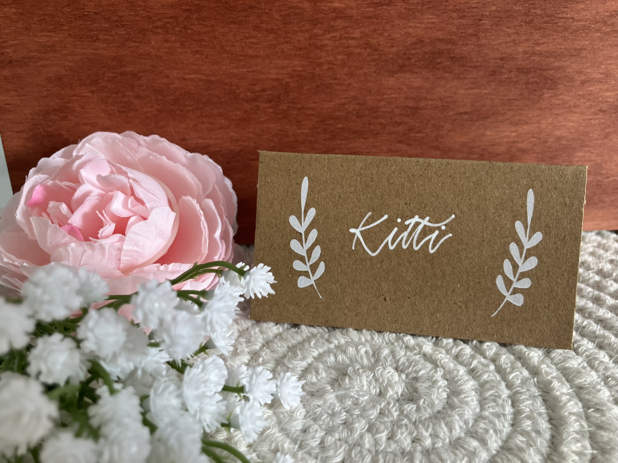 Félbehajtott „háztető” alakú, álló papír alapú ültetőkártya, melyet nyomtatott növényminta található. A neveket kézzel írom rá.