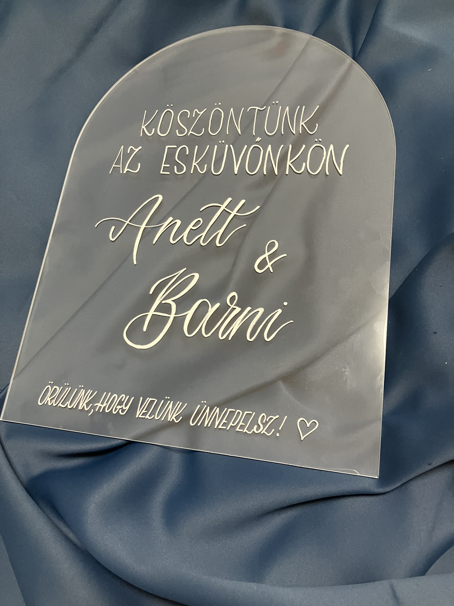 Boltíves matt esküvői köszöntő, vendégfogadó tábla.