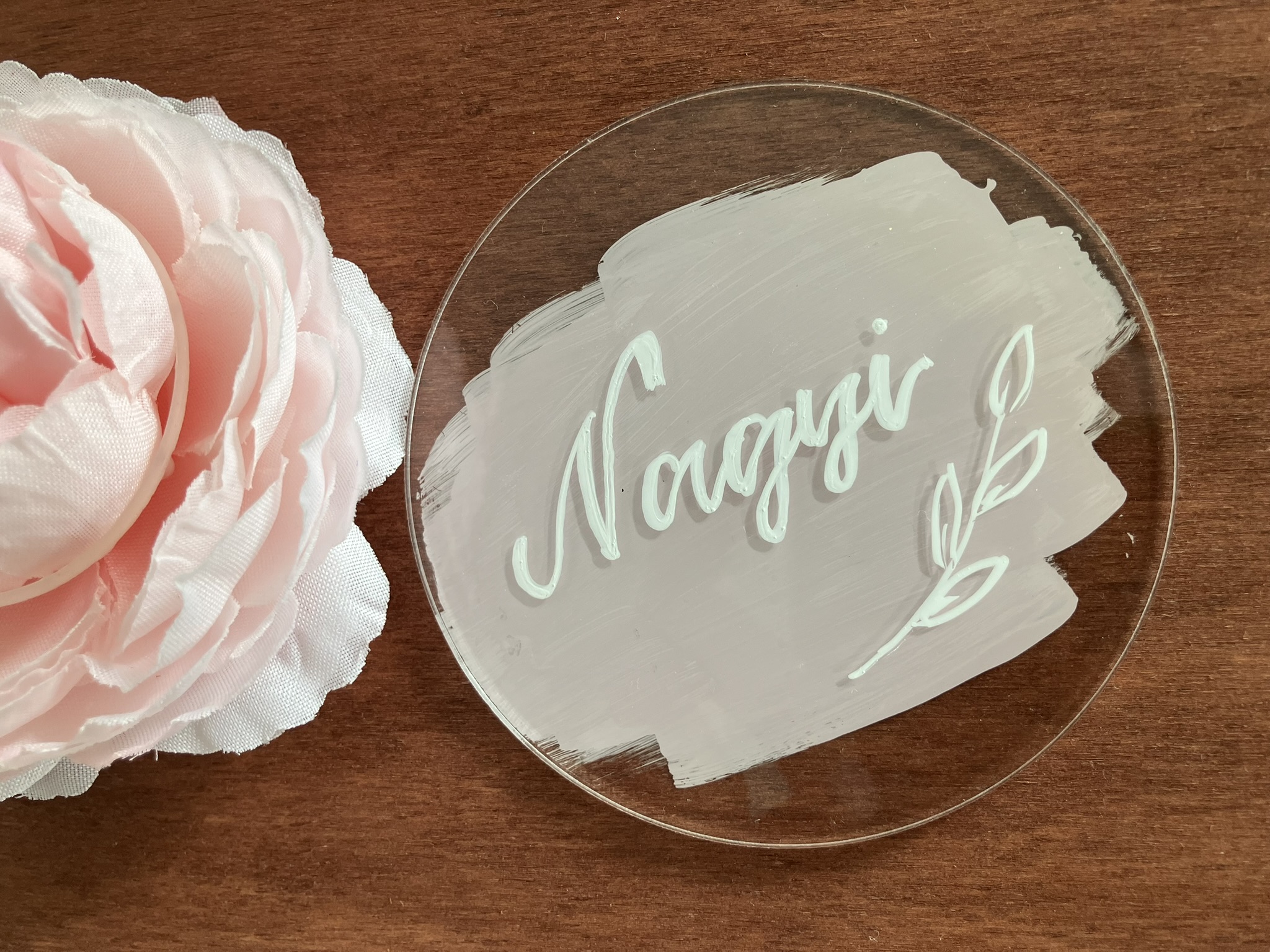 10 cm átmérőjű víztiszta plexi kör, mely kérhető különböző színű felirattal, illetve háttérrel vagy anélkül, esetleg kisebb díszítőelemekkel.