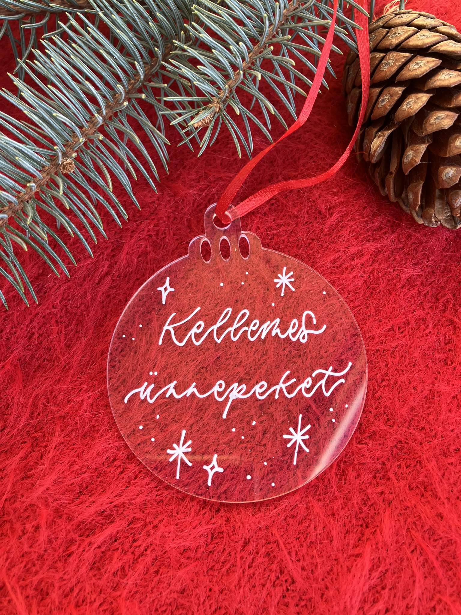7,5 cm átmérőjű kör alakú plexi karácsonyfadísz, melyre kézzel írom a kívánt nevet, feliratot – piros szalaggal.