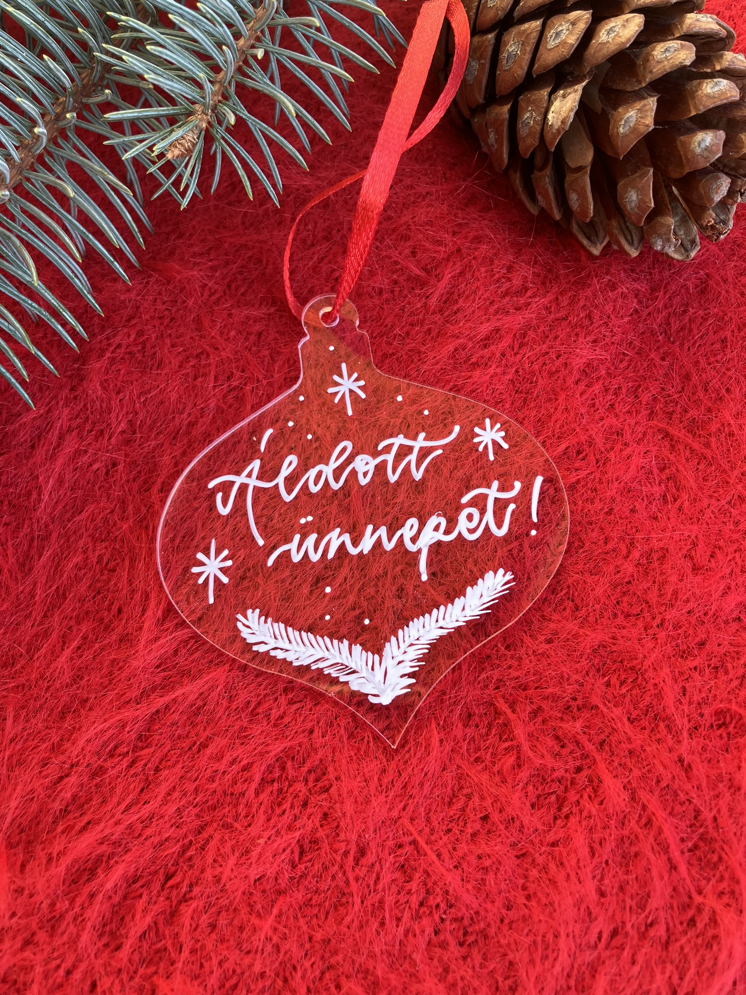 7 cm széles plexi karácsonyfadísz, melyre kézzel írom a kívánt nevet, feliratot – piros szalaggal.